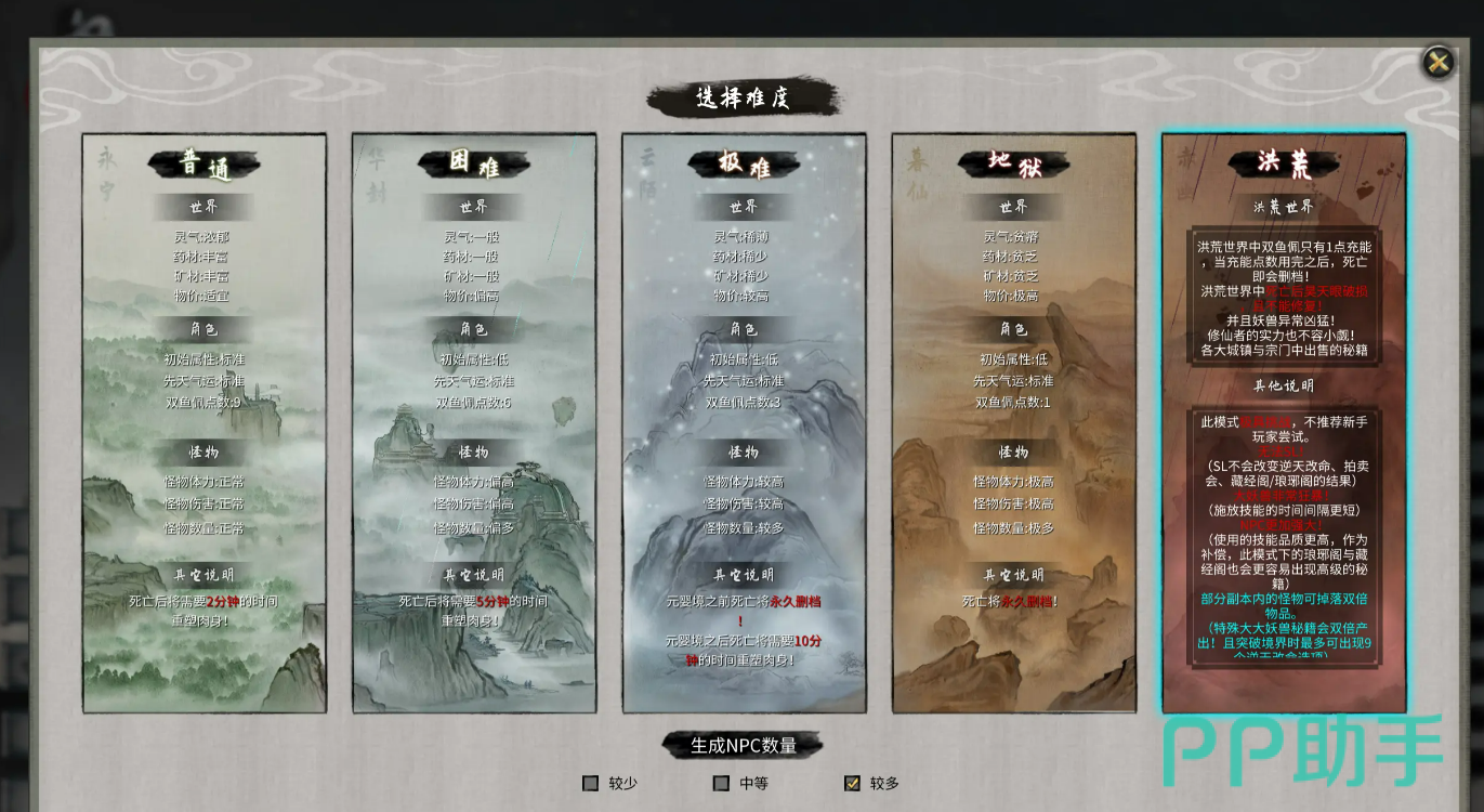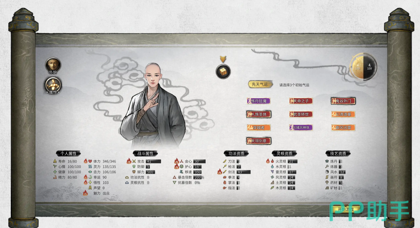 首先建议大家直接选择洪荒难度,这不仅能体验游戏的核心乐趣,还能避免低难度下技能效果过强导致的游戏乏味。当然,进入游戏后的一些基础选项也需要注意:在捏脸阶段,可以根据自己的喜好选择外貌,但魅力值建议适中,过高可能会吸引一些额外的麻烦任务,过低则可能错过部分特殊剧情。气运选择非常关键,因为它决定了角色的初始能力。建议优先选择能够提升攻击力的词条,例如“鬼谷外门”或“人族圣体”,这些不仅能提高输出,还能提升悟性,非常适合剑修开局。此外,气运的负面效果大部分对前期影响不大,不必过于纠结。需要注意的是,功法和灵根资质中,数值最高的那一项会决定初始攻击方式。如果数值偏低,可以通过不断刷新(R键)来调整。剑修开局是最优解,即使后期想转其他流派,也可以通过道具轻松更改灵根属性。