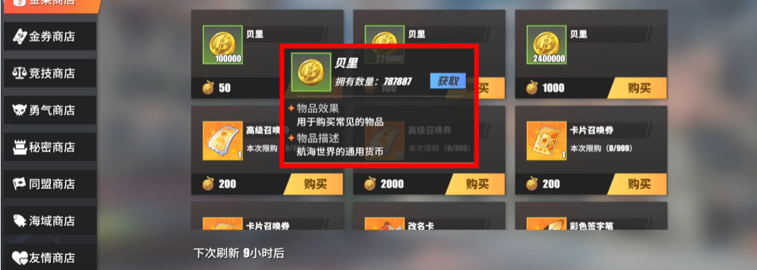 首先是勇气商店,参与“勇者挑战”活动,能领取兑换贝里的银色勇气点数,可在该商店来兑换。秘密商店也能换,只要参与“勇闯推进城”的任务,获得胜利就能拿到交易凭证,能直接领取到50万贝里。特惠商店也能换,需要消耗金币来兑换,最便宜的只有一次机会,后续回复原价。