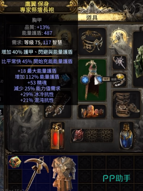 3、衣服。选择专家祭坛长袍,最重要的是带精魂,以及最大能量护盾,跟增加百分比护盾,最后刷两个抗性即可。