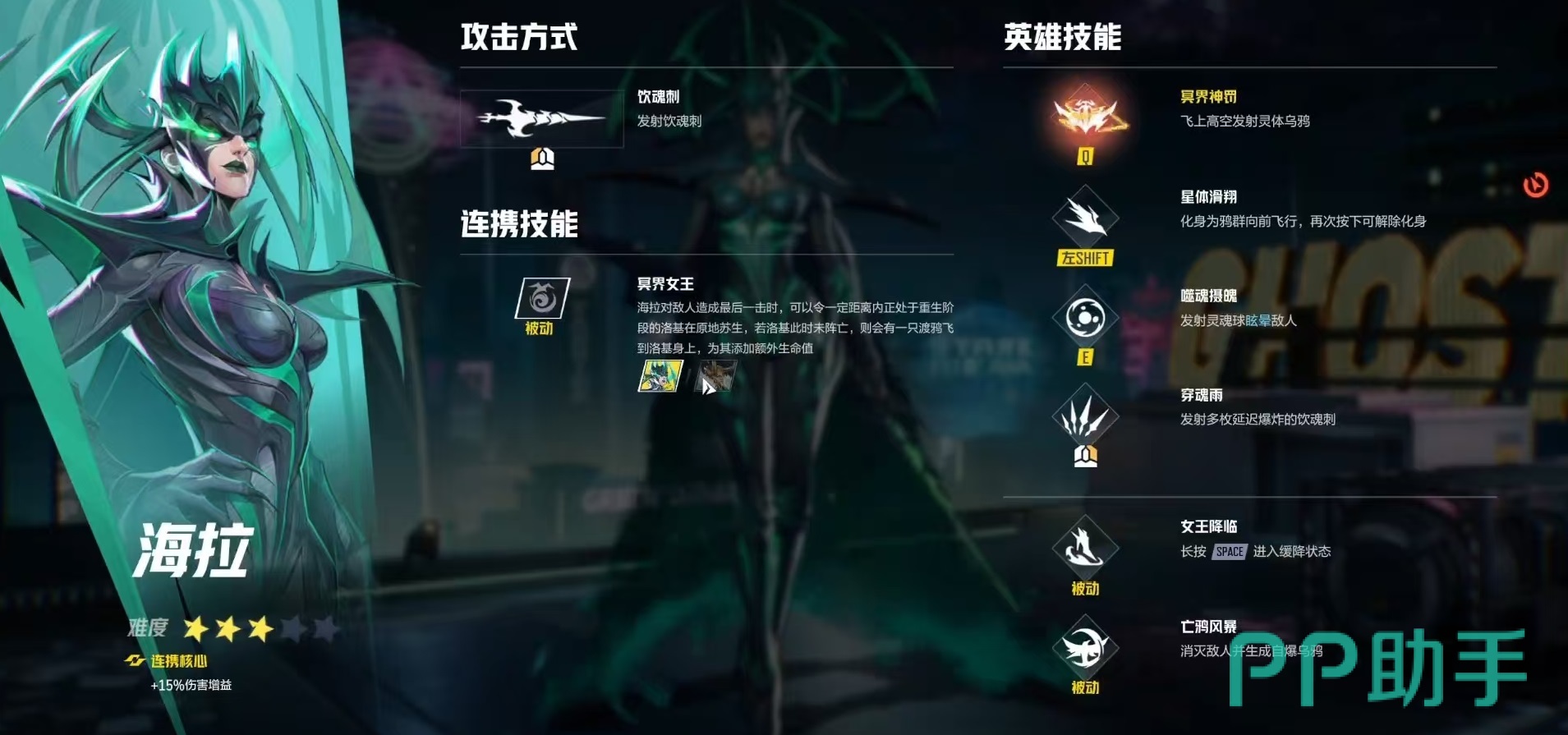 星体滑翔,化身为鸦群向前方飞行,该技能再次按下后,可以将化身解除。噬魂摄魄,发射灵魂球眩晕敌人。穿魂雨,发射出多枚具有延迟爆炸特点的饮魂刺。另外还有两个被动,第1个女王降临,能进入到缓降状态,第2个亡鸦风暴,消灭敌人生成自爆乌鸦。总体来说这是一个具有一定上手难度的角色,因为它很多技能都需要进行控制,尤其是一些限制类型更是如此。延迟爆炸特点,也非常考验技能释放时机和位置,只有多多练习,才能够真正掌握这些技能所带来的优势。