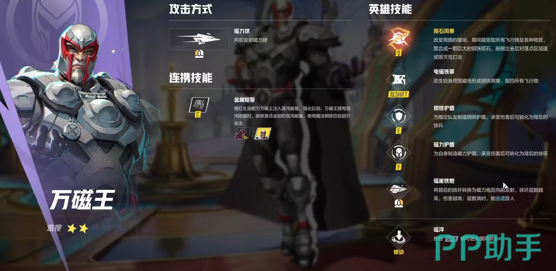 在整个漫威系列中,万磁王的能力绝对能够排到最顶尖的一类,它自身所具有的超能力,在变种人中都是佼佼者的存在,所以出现在漫威争锋中也是有着非常强的技能效果,小编今天就来介绍一下漫威争锋万磁王技能有哪些。因为这是一款节奏很快的游戏,所以并没有太多的时间在战斗内去熟悉角色,必须提前了解清楚。