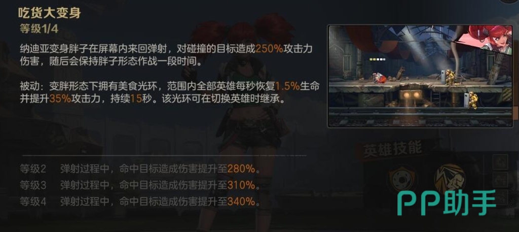 第二个技能为吃货大变身,在技能的加持下,她将被变身成为胖子状态,在地图上来回的弹射,会对命中的敌人造成一定的伤害数值,在攻击结束它依然会保持一定时间的胖子状态,而在此状态下如果能够触发幸福光环,那么则可以使友方每秒恢复生命值,并且提升一定的攻击力,辅助能力一流,这个光环也是可以继承在自己的队友身上的。如果运用好了完全可以利用这个技能帮助我方提供长时间的续航能力。