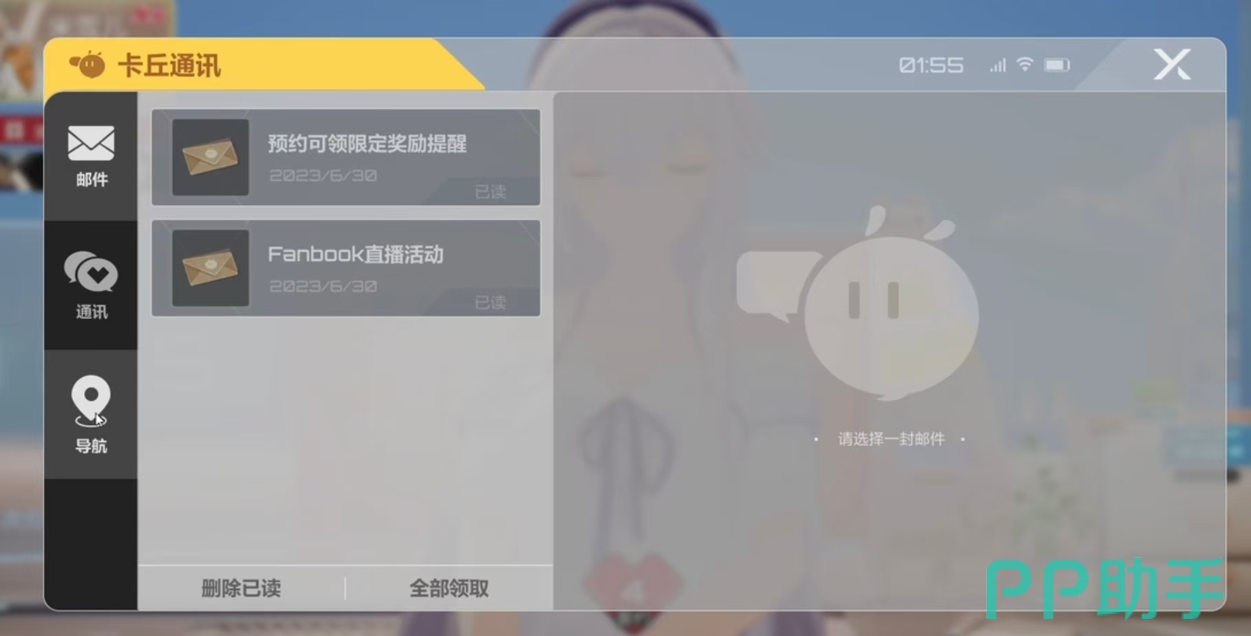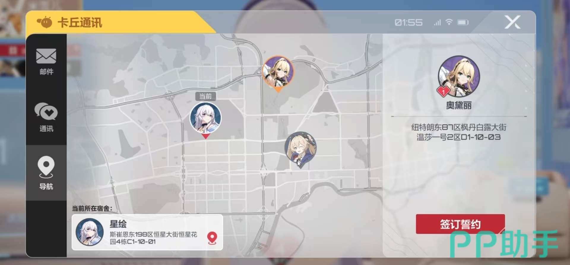在邮箱最左侧的选项中点击“导航”,这时会出现不同的角色,点击前往角色所在的宿舍,首页的角色就会更换成你选择的角色,即完成看板娘的更换。