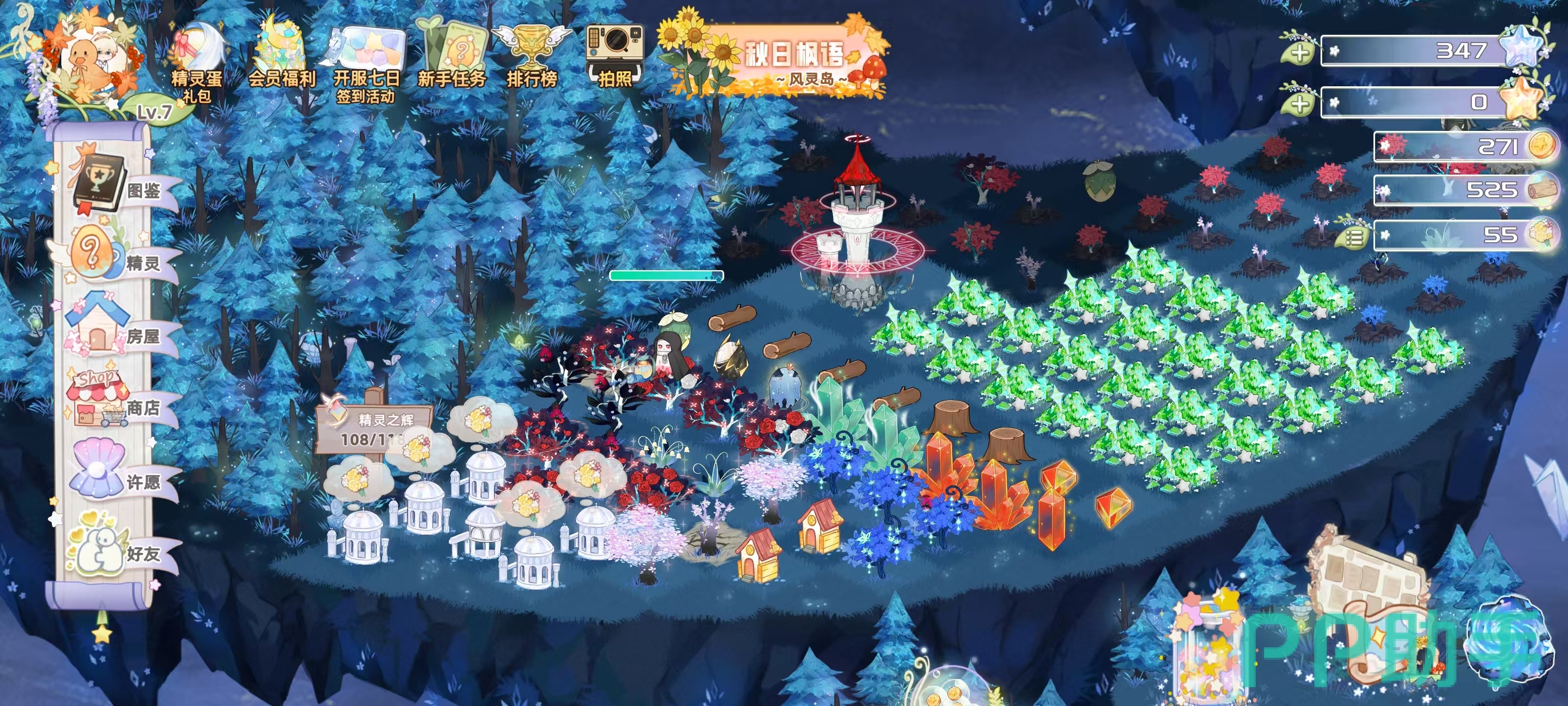 这款休闲作品优点,在于自身画面非常清晰,对于零氪玩家也非常友好。整个游戏循环其实非常简单,首先通过精灵采集树来获得木材、果子,需要消耗体力。然后再给精灵吃下果子,就可以恢复体力,通过元素合成的方式来获得精灵,用木材合成小屋,放置同等级精灵。一切内容都可以选择3合1或者是5合2。当进去新手教程后,首先给予玩家两个岛屿和一个活动岛,如果没有特权卡,精灵会无休止进行采集,这时早上会出现各种东西无法合成就有可能被淹没。