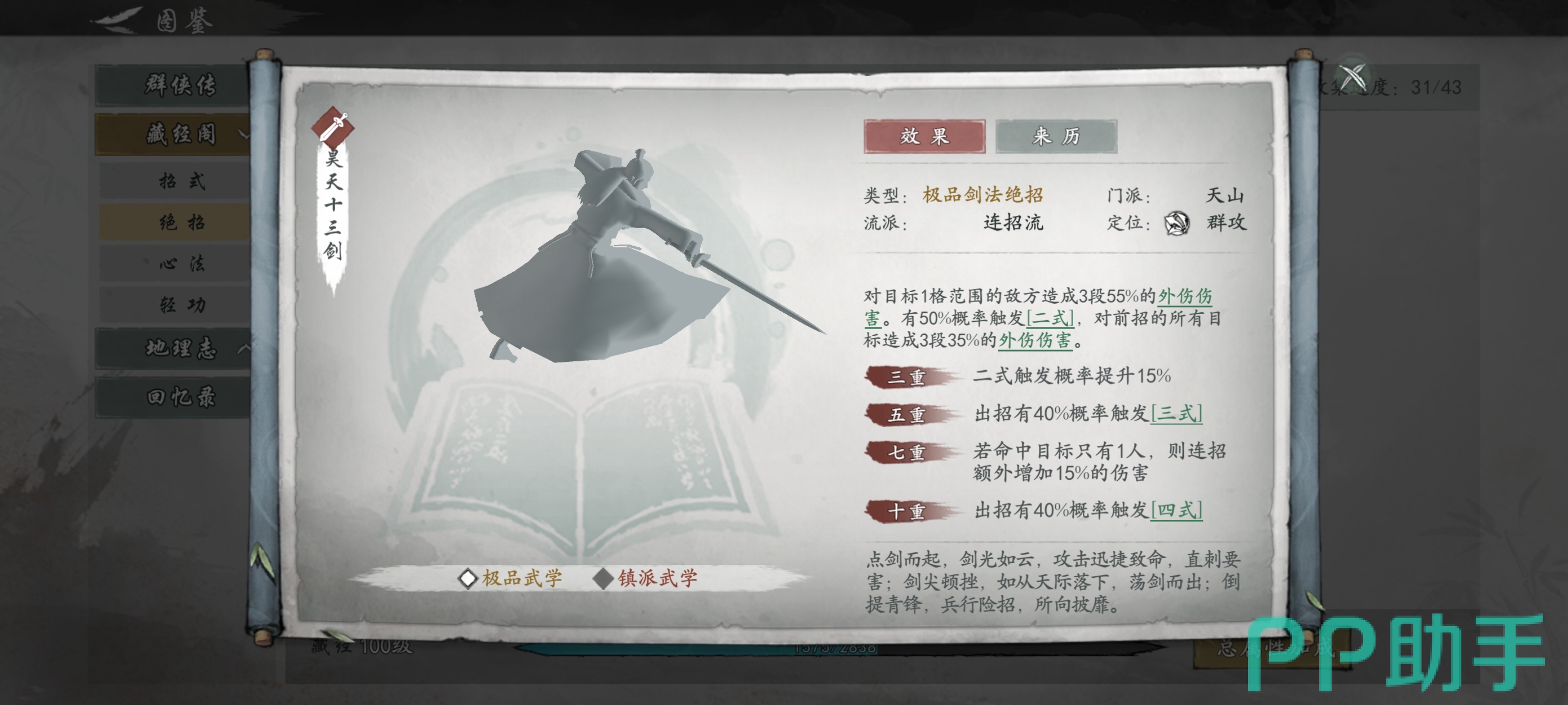 武学之外,心法和轻功的取舍也是不容忽视的。多阵阵容建议配合心法逍遥游使用,它灵秀的属性加成使天山派身法优势进一步加强,也给连招带来了更多容错率。轻功方面则推荐选用踏雪无痕的轻功,此轻功不但身法诡谲而且在作战时可以迅速拉近和敌人之间的关系,给连招起手制造了极好的条件。“踏雪无痕”这一技能,无论你是追踪敌人还是避开关键技巧,都能使你在战场上表现得游刃有余,如同走在薄冰之上。
