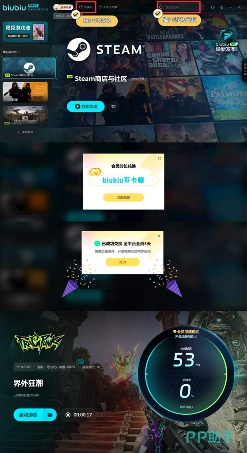 为了能够玩好这款游戏,除了熟悉人物技能以及操作特点之外,还需要有一个良好的网速环境,biubiu就可以帮助达成这样的目的。目前biubiu的新注册账号福利为赠送三小时会员时间。除了对于新手的福利之外,还有一项通用的兑换码,每个号都能使用,那就是【biubiu不卡顿】,这个兑换码能直接兑换72小时时间非常划算。第1个人物是博洛克,它擅长技能伤害,能进行视野控制和陷阱布置,使用肩扛式的发射器发射高爆火箭弹,当弹头命中目标时,对范围内敌人都能造成高额爆炸伤害,并产生击退效果。