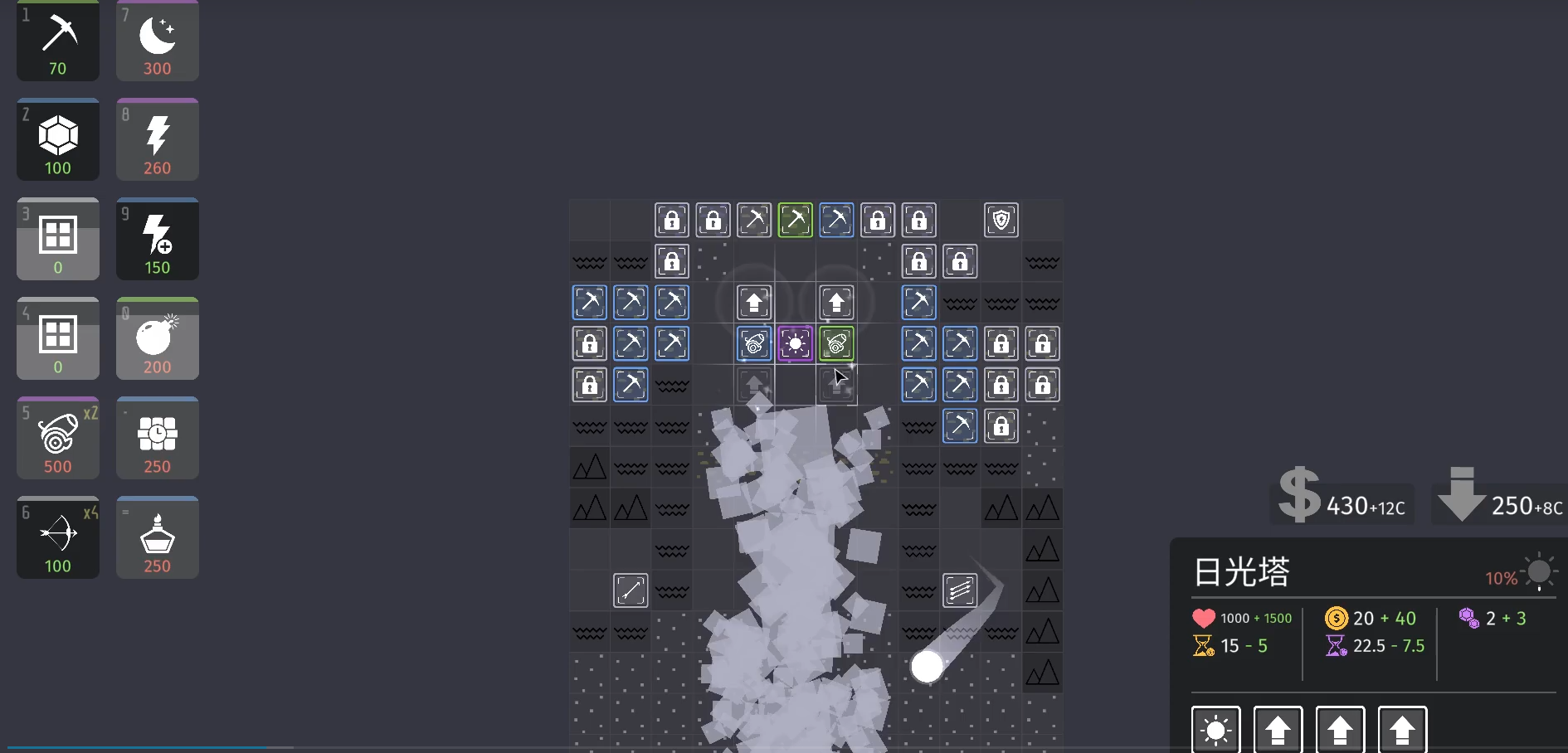 其次,在小技巧方面,大家需要合理利用暂停功能来调整炮塔的放置位置或升级顺序;在敌人大量出现时,及时使用炸弹或冰冻炸弹等道具来减缓敌人的进攻速度;注意复活塔的使用时机,以确保在关键时刻能够复活重要的炮塔或金矿。