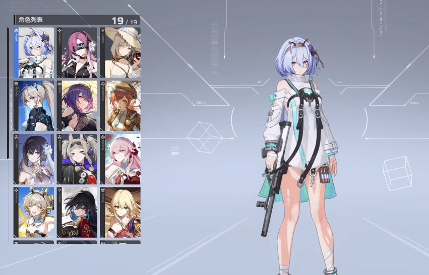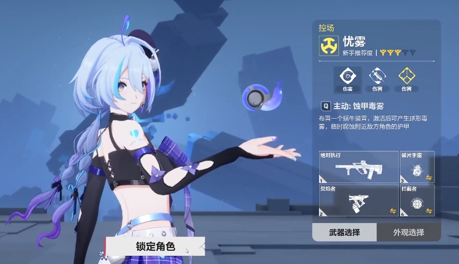 关于忧雾角色立绘,是一位青春活泼的少女,在设定中给了她一个独特的展现方式,就是选择她作为主视觉的时候在步行的时候会有独特的脚步声。她的枪械是绝对执行,因为弹道的关系在射击能力上属于一般的数值,需要靠玩家加点和加属性才能有好的发挥。