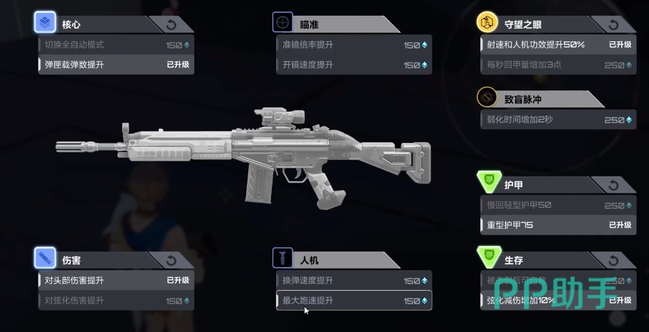 在他的天赋加点上,建议按照增加机甲、提升弹夹容量、增加射速、提升弦化伤害、提升换弹速度这个顺序来进行加点。
