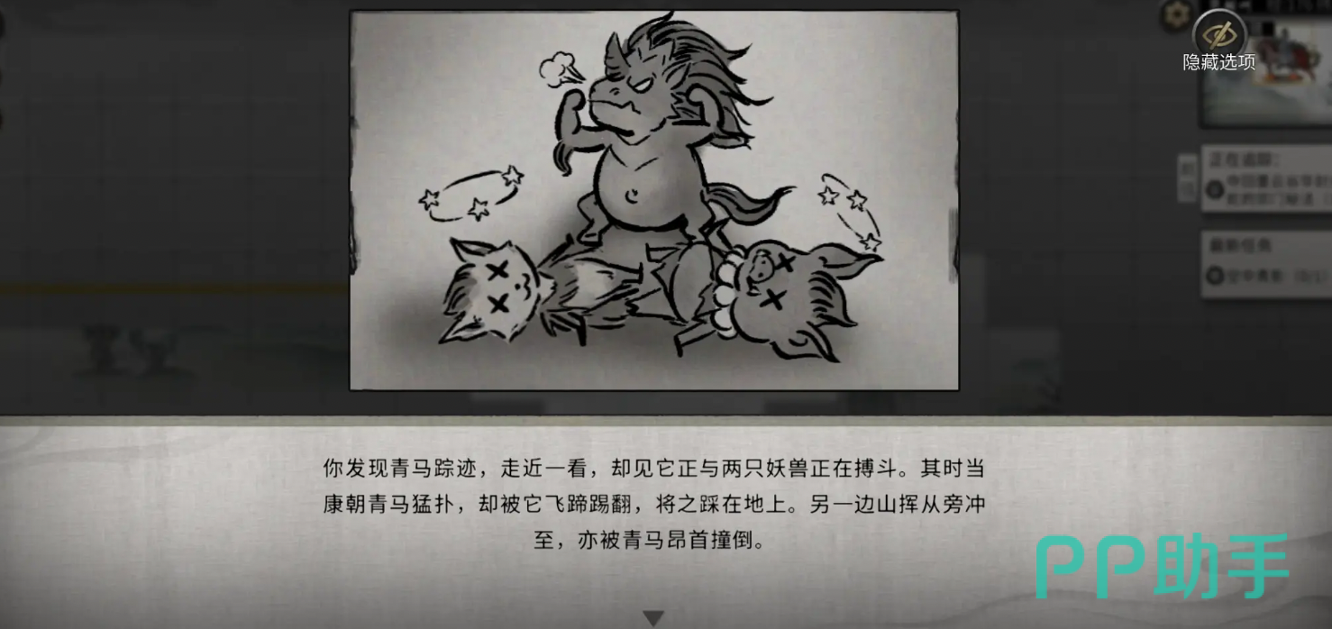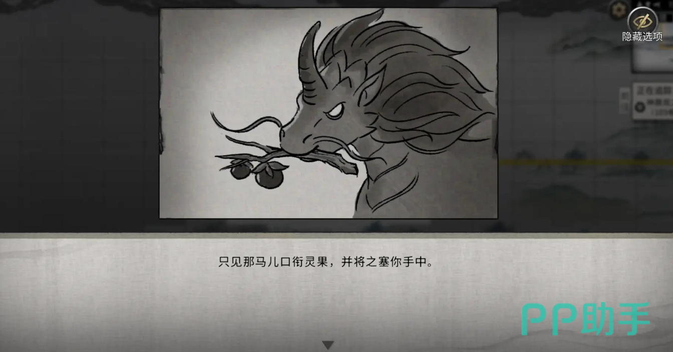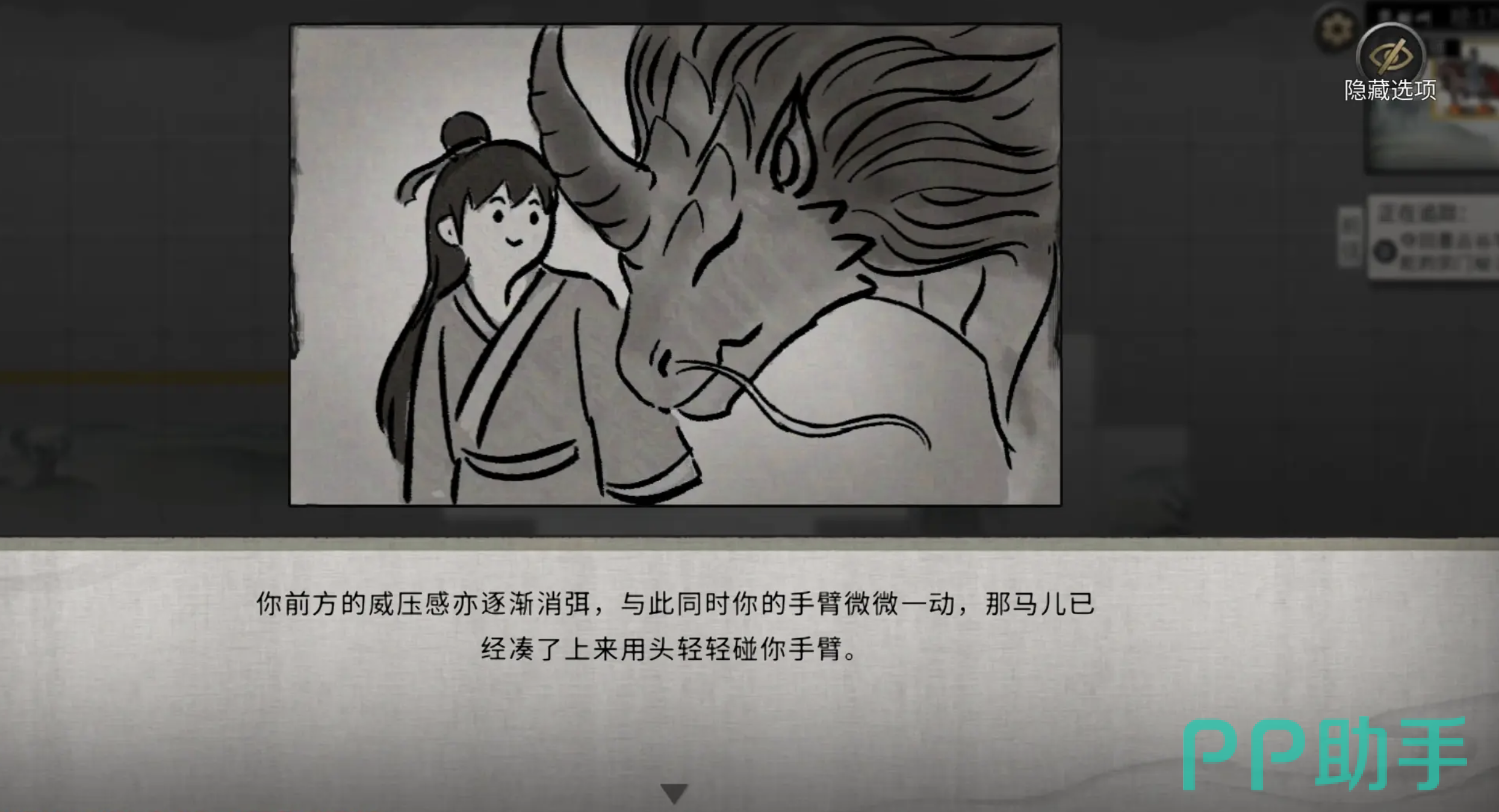 继续探索地图时,玩家会再次遇到矔疏。同样需要选择“伸手摸头”以推进奇遇。这时,玩家可能遭遇飞沙走石,选择跟随探索后,会有机会坐上青马的背,体验它踏空而行的能力。