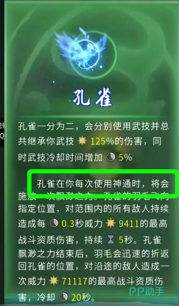 要问孔雀为什么是最优解?其实答案很简单:它输出高、覆盖面广,最重要的是,技能加成直接而明显。孔雀技能的基础攻击间隔为0.3秒,通过后续强化,可以逐步缩减到0.1秒。而且在打BOSS时,孔雀的技能持续时间和神通配合度极高,让你稳稳占据优势。