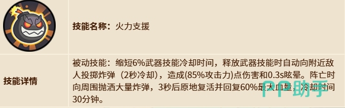 然而需要注意的是,不同星级的炸弹人所带来的效果也是有所差异的,一星时他的被动技能为释放武器技能时自动向附近敌人投掷炸弹,还要包含2秒冷却时间,造成65%攻击力的伤害,阵亡时向周围抛洒大量炸弹,3秒后原地复活并回复20%最大血量,冷却时间为30分钟,二星时则会缩短3%的武器技能冷却时间,同时造成的伤害提升至75%,阵亡时的复活血量也会增加到40%。