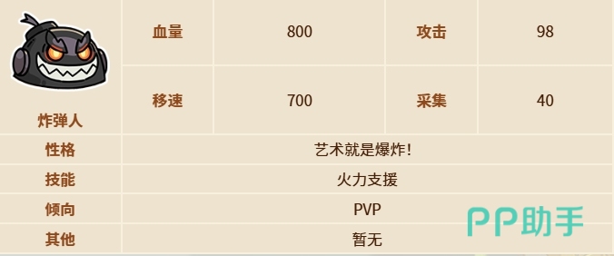 当炸弹人达到三星后,其攻击力可高达134点,这样的基础伤害让炸弹人在战场上具备了极高的输出能力,除了高额的基础伤害外,他的技能在战斗中的效果是跟武器有关的,只有武器技能释放之后他才会自动向周围的敌人投掷炸弹,造成相当于攻击力65%的额外伤害,即使在阵亡之后,炸弹人也会进行一次最后的反击,向周围抛洒大量炸弹,并在3秒后原地复活,恢复20%的最大血量。