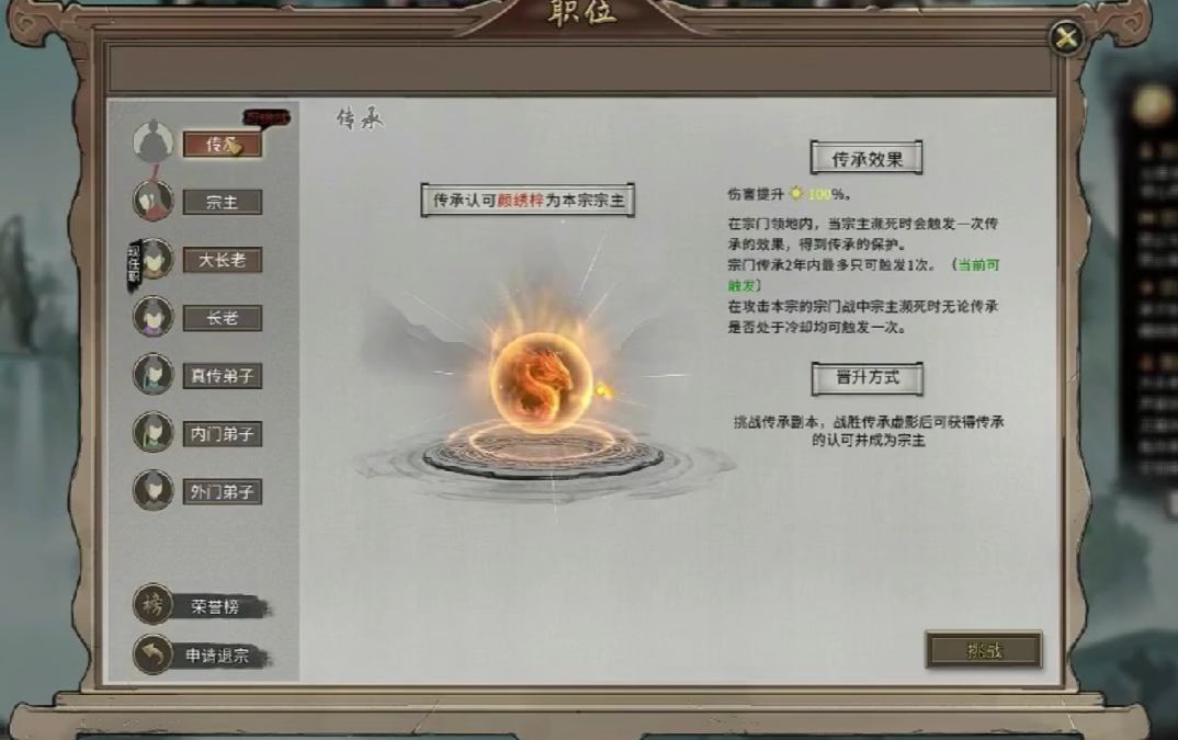 如若玩家是宗主,有两种退出方式,第一种是玩家将宗主职位移交给另一个入门弟子,第二个方式是,玩家直接解散宗门,但无论是哪一种方式,玩家都不能够再获取该宗门的任何奖励机制任务,如果玩家仍然想要保留宗门内的资源,则可以选择预留宗门的锦旗进入到背包内,后续玩家还可以通过继承宗门的方式,重新回到对应宗门。