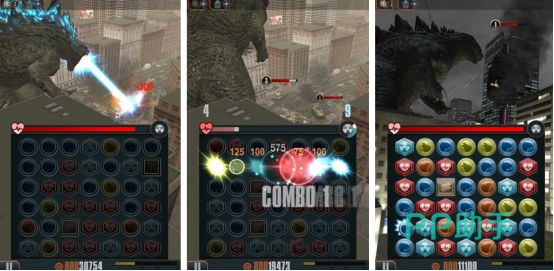 根据同名电影进行改编而成,1:1高度还原了当中的经典剧情以及非常震撼的场面,采用先进的引擎技术将特别真实的3d战斗场景呈现出来,在这里玩家将会感受到哥斯拉的破坏力。在比较震撼的背景音乐扶持之下,您将会听到疯狂的怒吼声,原本一片祥和的城市却因为怪兽的出现,导致所有的建筑物都化为平地。玩家在这里最主要的玩法就是,要在不同颜色的宝石当中,尽可能将更多的同色宝石连接在一起,释放出较大的攻击力。