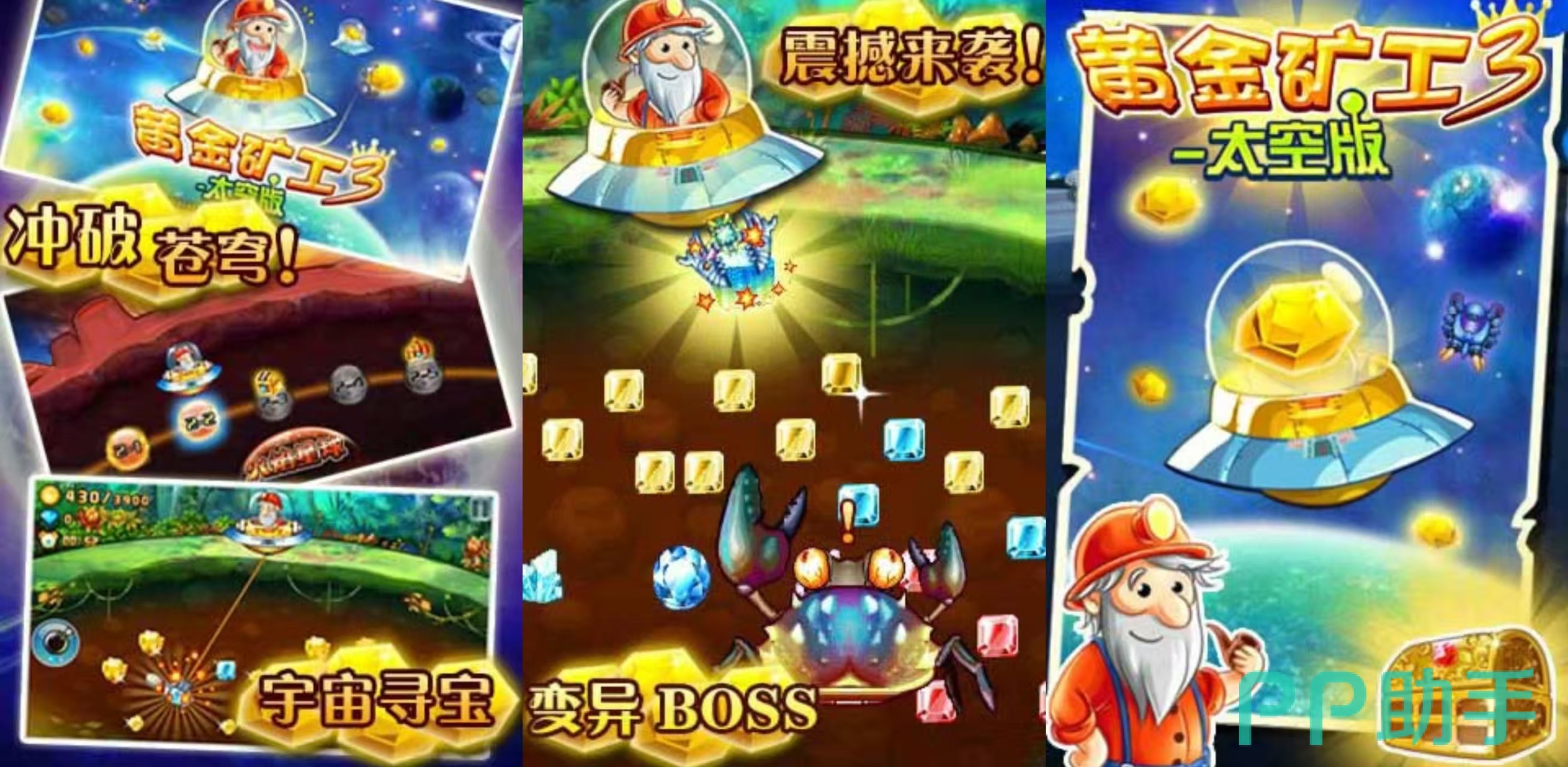 《黄金矿工-太空版》这个版本游戏把背景做成了太空的样子,玩家会来到太空中进行淘金,化作游戏中的老矿工角色,用钩子来挖掘更多的矿石。使用不同的按键可以使钩子释放,需要到达指定的分数才可以过关。可以看到五种不同的星球,每一个星球上也会出现变异的boss,也有可能获得神秘的宝藏,在挖掘的时候也会更加的过瘾。