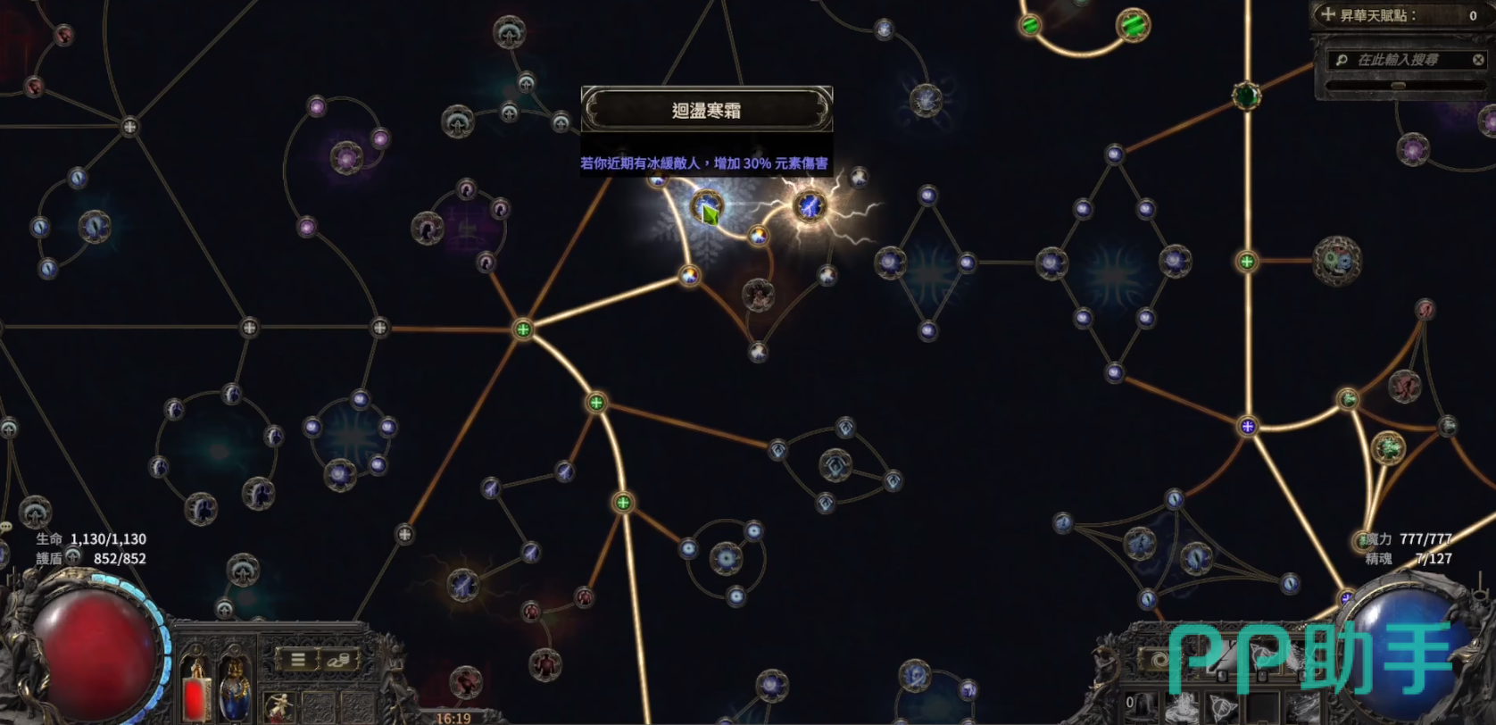 那么往上一条选路,点击那一个带有闪电纹路的天赋迴盪寒霜+迴盪雷电,效果是近期有感电敌人,那么增加30%元素伤害,冰缓敌人的时候可以获得30%的元素伤害。可以通过物理转元素伤害去打,这两个是玩法体系必须带的。
