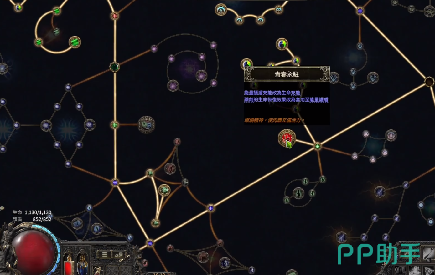 那么接下来,点生存路线上的青春永驻,这一条线都可以直接直线点。因为前期可能玩家的药水不充足,如果有青春永驻的效果,那么你可以将护盾转化为生命值,稍后就能迅速恢复血量。大后期就可以把青春永驻洗掉,将天赋换成以护盾为主的那一条线。