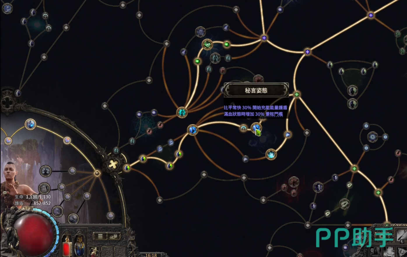 接着抓取另一个关键点秘言姿态天赋,比平常快30%开始充能能量护盾,满血的时候还能增加30%眩晕门槛。这一个关键天赋可以让充能护盾更快,把这条路线的几个都点上的话,就能实现很短时间内就开始回补。