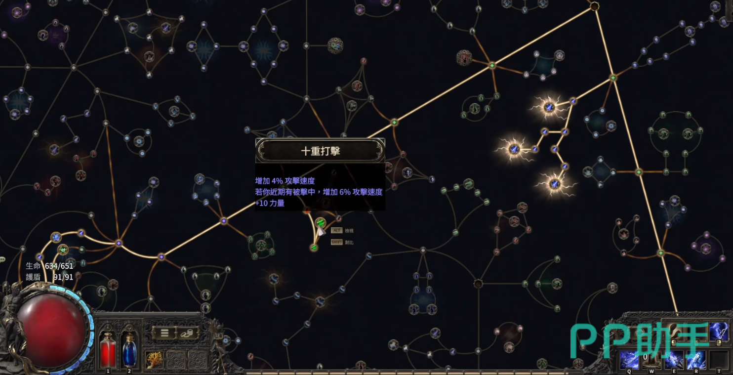接下来沿着这条路径往上走,经过十重打击这一条天赋,建议点上。十重打击的效果是增加4%的攻击速度,如果玩家在战斗中有被击中过的话,还能够增加6%的攻击速度以及10点力量。