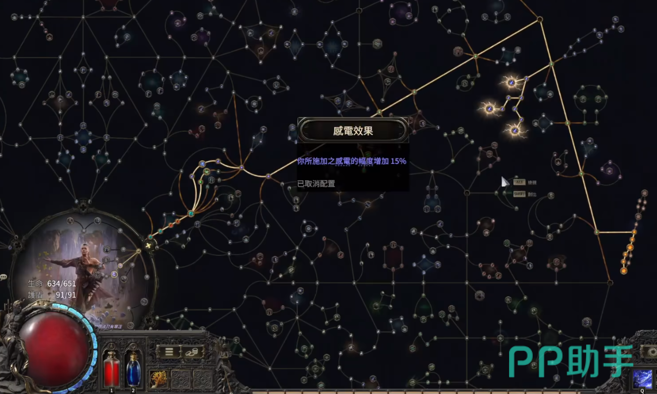 然后继续往上点,直到拐角处点击三个带有闪电花纹的圈,建议三个大圈都点上,三个的效果分别是:无限循环有25%的几率,消耗敌人身上一层感电来重新施加该技能。狂野风暴则是提升15%的最大闪电伤害。暴露于风暴,主要是增加18%雷电抗性以及伤害穿透,对待有闪电暴晒敌人的暴击伤害增加30%。