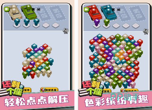 相对于单纯的挪车游戏,这款的玩法又增加了其他的元素,就是里面有不同颜色的汽车以及不同颜色的小人,需要将里面的人物顺利的做到汽车上,然后让车辆移动。所以说在挪车的过程中,首先需要在每个关卡中保证,三个小人可以顺利的利用箭头找到属于自己的车辆,缤纷的色彩以及轻松的点点玩法,让很多的人喜欢。
