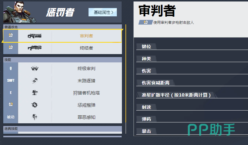 官方给他的身份定位是决斗家,处于输出类型,他拥有强力的武器,普攻可以在审判者以及终结者两种之间进行切换,这两把步枪基础伤害本身就很高的。
