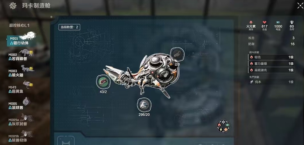同样的也可以跟随任务流程建造好玛卡制造商以后断路需要的材料来进行制作。这里所生产的玛卡都具备生产技能,喷火鼬也在其中,需要先解锁配方之后再去收集相应材料,然后就能点击直接制作出来。解锁配方需要消耗玛卡制造配方残页,或者是指定的配方书就可以解锁。