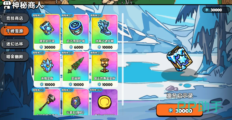 首先可以打开主页右上角的兑换商店,接着找到下方的雪币,我们要用这种东西兑换冰书。一共需要花费三万枚雪花,之后再打开神秘商人。选择第二个千峰雪原,看到第一个武器就是冰书了,之后点击购买即可。