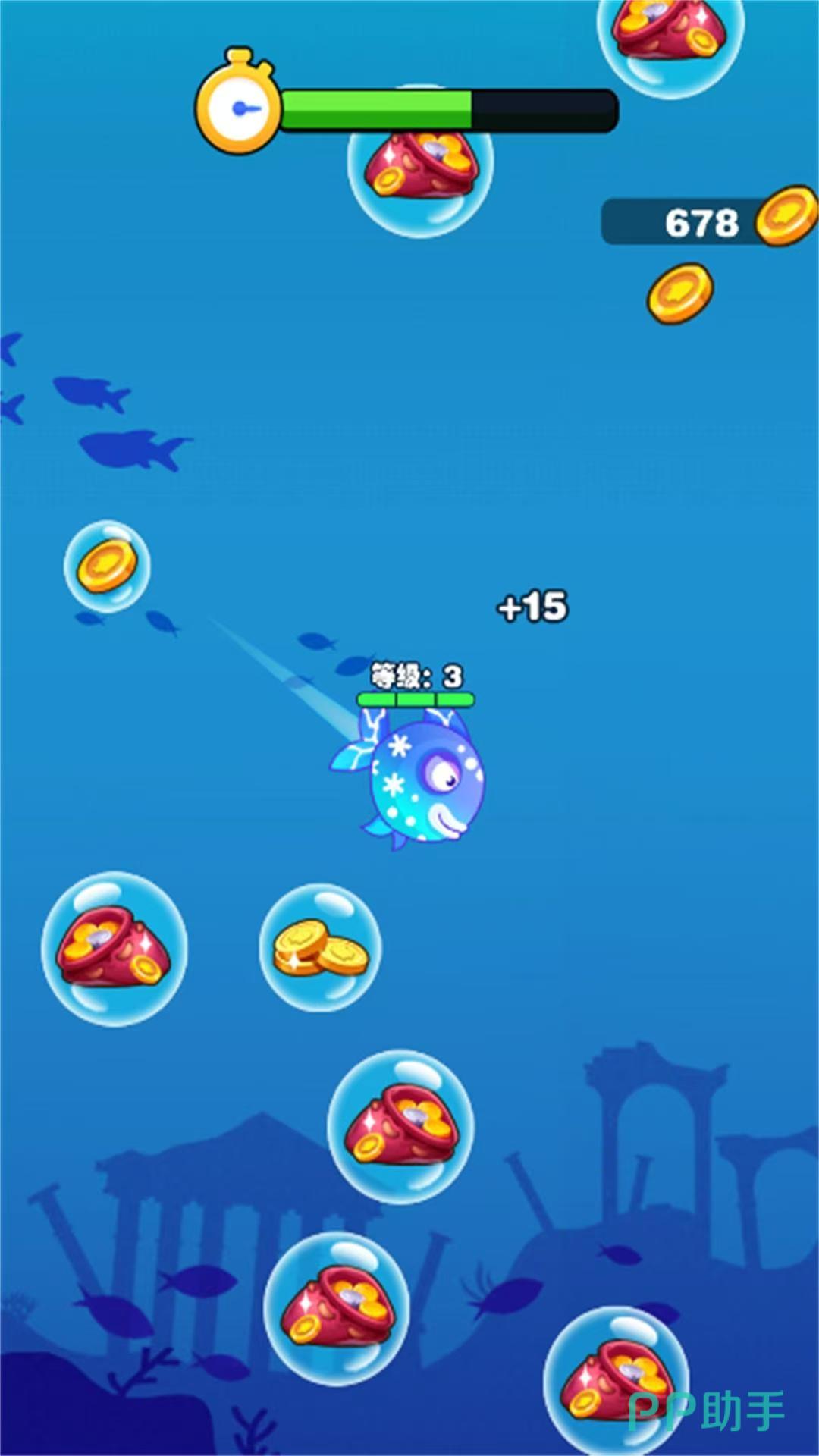 趣味无穷的海底神秘世界,有好看的海星宝宝,和五颜六色的鱼类,点击屏幕上的按键,操作小鱼在水中欢快的畅游,体验无忧无虑的时光。探索海底时,要小心大鲨鱼的攻击,防止被当成食物吞噬,危险来临时使用道具帮助脱险,成功打败大鱼快速成长起来,挑战更高难度的关卡。