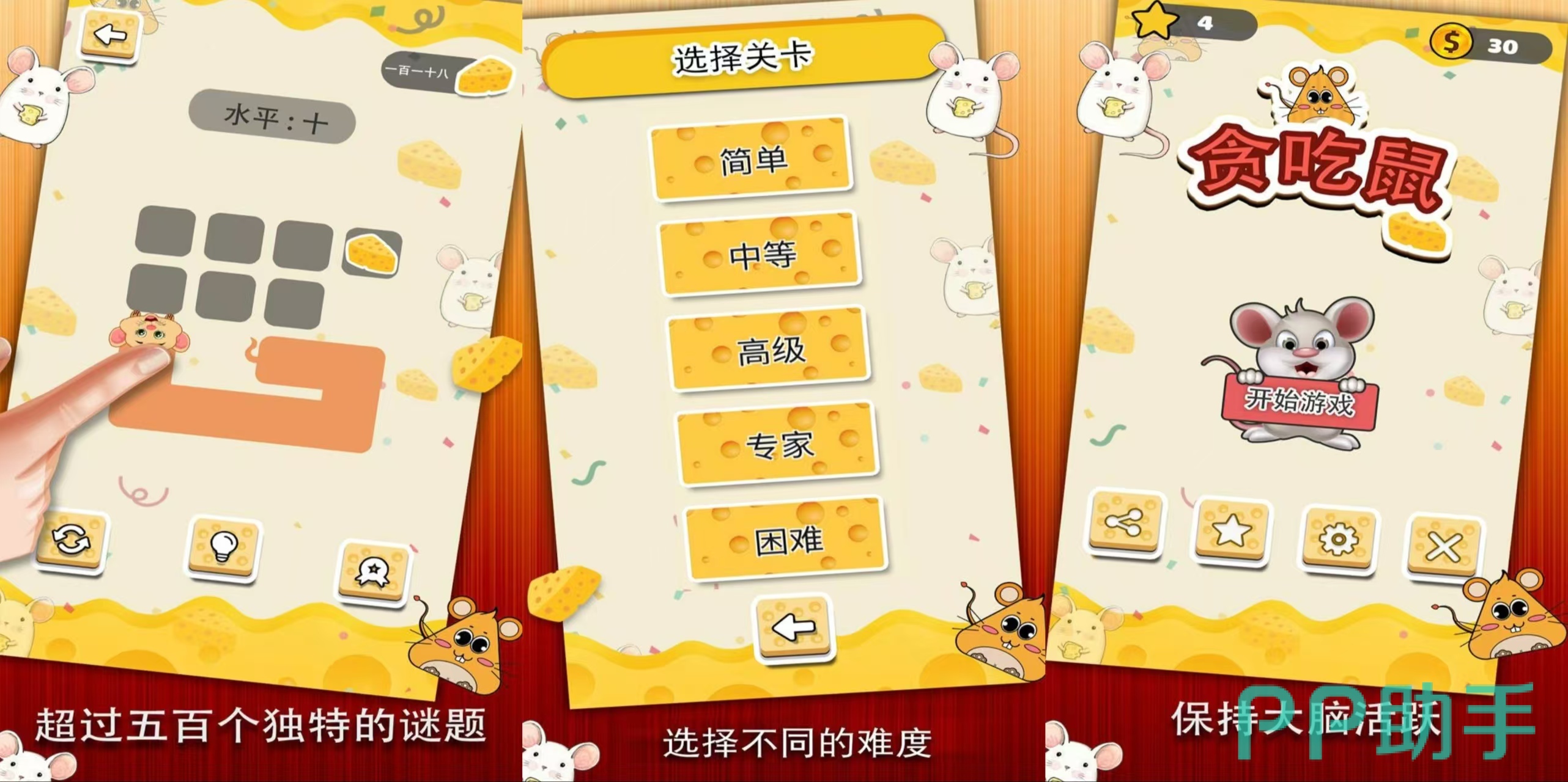 《贪吃鼠》游戏里面拥有这一只非常饥饿的老鼠,需要靠奶酪来填饱自己的肚子,想要奶酪就需要完成游戏中设定的谜题,必须顺利的通过所有的格子才可以拿到奶酪。游戏中设置了五种不同的难度,在每一个难度中都能看到不同的关卡,每一个关卡都有一个提示的功能,可以用闯关的奖励来购买提示,游戏中没有时间要求可以无限畅玩。