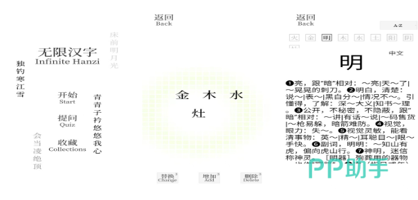 这款文字游戏的玩法是合并。我们需要将系统给出的多个文字,选择两个合适的结合在一起,来创造出一个新的文字。比如说你可以选择一个日字,再选择一个月字,这两个合在一起就是明,这样就算完成挑战了。系统也会将这个字的意思展示出来,帮助我们更加深刻的理解这个字,对于那些你收集起来合成好的字,可以拿来进行更加有趣的问答闯关哦!
