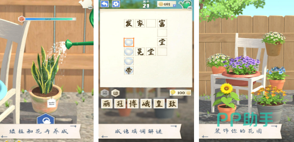 这是款文字手游里,我们将会扮演成一位从钢筋水泥的城市中,返回田园小山村的女孩。系统会给出很多成语接龙类似的文字挑战给我们,如果完成了挑战,就可以获得对应的水滴,水滴是可以用来浇花的,嗯这样我们就能将自己的小花园打理得越来越好看!和当你通关之后,也会获得一定的金币,这些金币我们可以拿来买道具帮助我们通关,或者是去购买更加好看的花盆。你也来完成挑战装饰好自己的后花园吧!