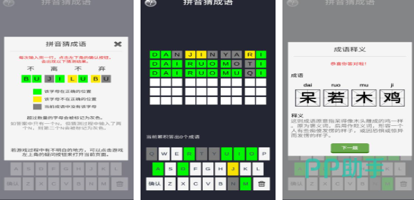 在你玩这款猜成语手游时,逐渐就可以认识到更多不同的文字和成语了。在开始阶段,玩家可以得到很多字母,将字母排列成拼音,然后猜测出正确的成语,根据系统给出的颜色提示, 一步一步去摸索正确的答案,这个过程非常有意思!在你挑战完成后,可以得到这个成语的释义,赶紧来挑战看看吧!