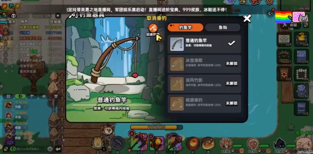 如果玩家们想要获得鱼竿,可以立马点击图标,让自己进入到钓鱼的状态,游戏中的鱼竿也分为不同的款式,他们获得方式都是不同,现在只能通过最低的进阶版英勇宝典,获得的这些鱼竿。