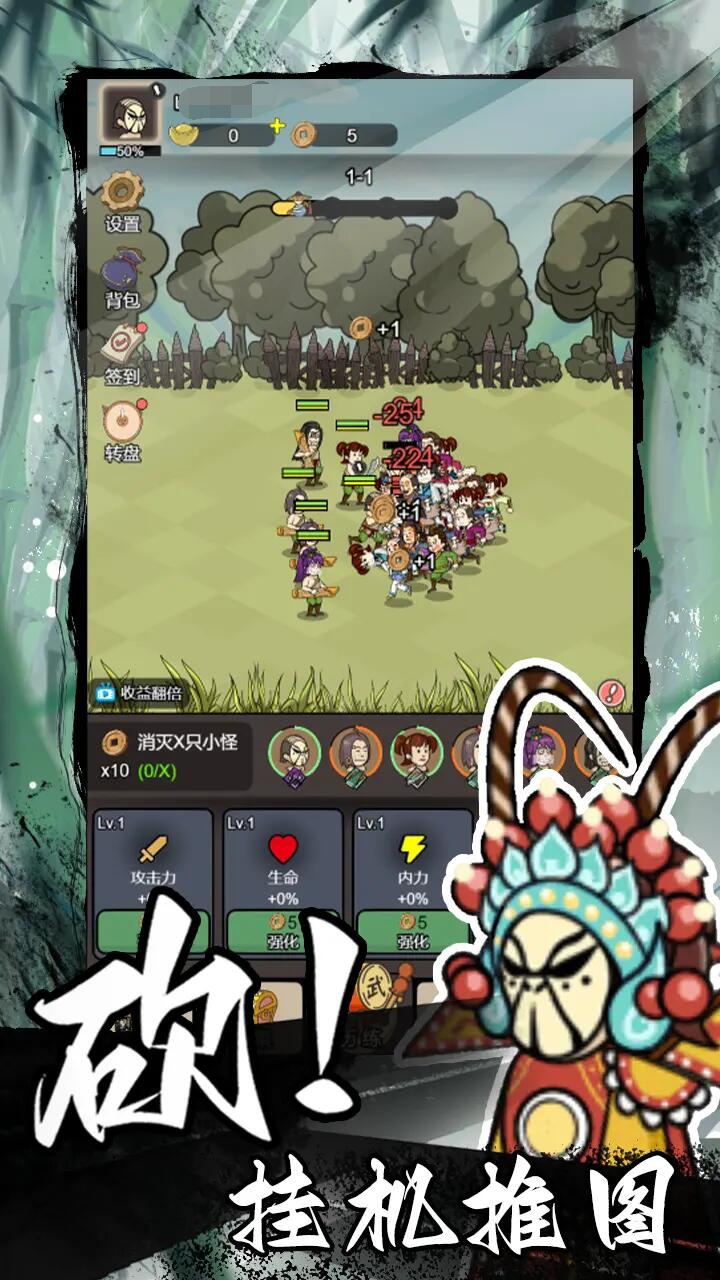 江湖之上,风起云涌,谁主浮沉?作为一个踏入江湖上的小虾米,幸好闯荡江湖的不是你。之所以这样说,是因为这是一个可以招募和上阵很多角色的武侠挂机游戏。玩家的核心就是放置,很多战斗都是不需要你玩家动手实操。而游戏在成就感这方面很有研究,每一个小怪的掉落都会有着非常醒目的提示,一刀下去,金币暴涨,真是成就感满满。
