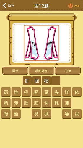《猜成语》这款游戏相比上一款游戏来说难度更小,因为每一个关卡只有12个字被展示,玩家只需要在这些字中找到与图片相符的即可,不过随着关卡的不断通过,游戏的难度也会大大增加,如果想不起来还有提示和求助两个功能来帮忙,而且这款游戏的色调采取了非常温暖的黄色,陪伴人物还绘制的非常搞笑。