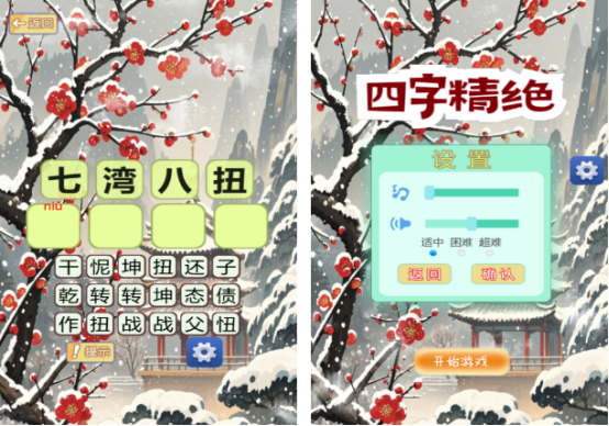 这款专门为各个年龄段的人准备的休闲趣味性游戏中,你可感受到四字成语所具备的魅力,除了整体的游戏画面充满着古色古香的气息,仿佛你也成为了古代的文人墨客一样,还提供了三种不同的难易程度。通过选择以后,你就能点击开始游戏,完成不一样的题目内容。填字的时候会有相关的提示内容,你只要正确的组成成语就可以了。