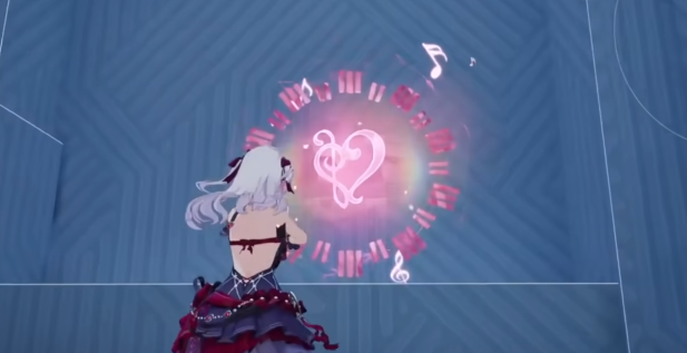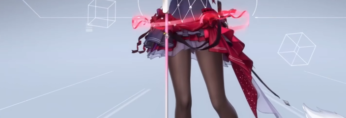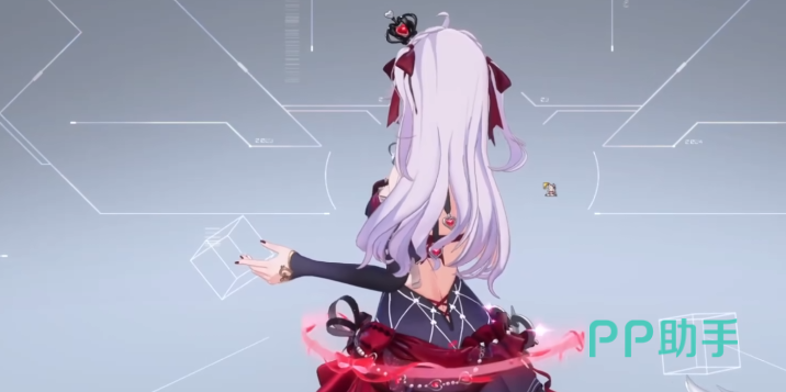 衣服整体的设计也是比较简单,胸口超大的暗红色蝴蝶结,吊带也是实体建模,有银色挂饰。手部则是不对称的设计,左手是长袖套,右手则是只有手腕上有一个小小的装饰用袖套。裙摆的设计则显得有层次感,是三层结构,最里层是半透明结构,后面裙摆上的挂饰也是实体建模。