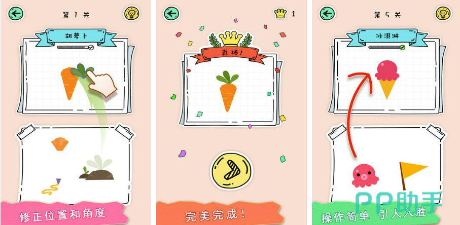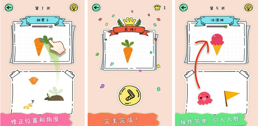 这是一款将拼图与解谜结合的游戏,每一个关卡会为大家设定一个图片,并在下方给出两到三个元素,玩家们需要根据给到的元素去完成设定图片的样子,在这个过程中可以不断地去修正每一个元素的位置和角度,每一个关卡给出的目标图片都不一样,快来游戏里面体验一场解谜与拼图的快乐吧。