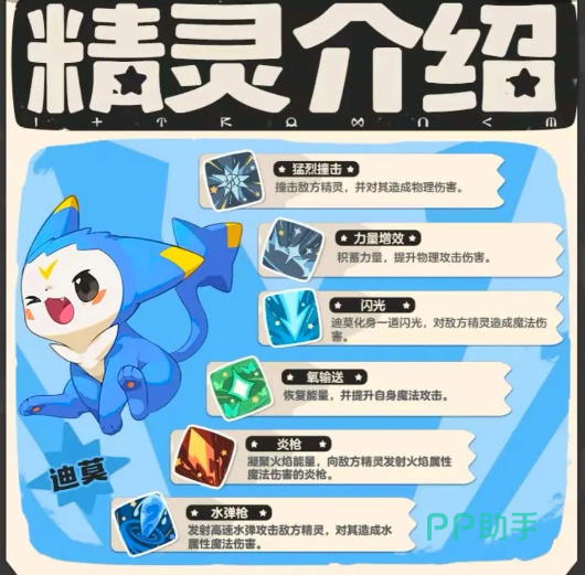 其次,在技能方面,迪莫拥有多种强大的技能。初始技能“猛烈撞击”可以直接挑飞敌人,造成高额物理伤害;而“力量增效”则能有效增加攻击力,提升输出能力。此外,“闪光”技能可以让迪莫变成一道光,重创敌人并带来魔法伤害。随着等级的提升,迪莫还会解锁更多技能,如“氧输送”用于快速回复能量并提升魔法攻击力,“炎枪”凝聚高额火焰伤害攻击敌人,“水弹枪”发射高速水弹攻击并克制火属性精灵等。
