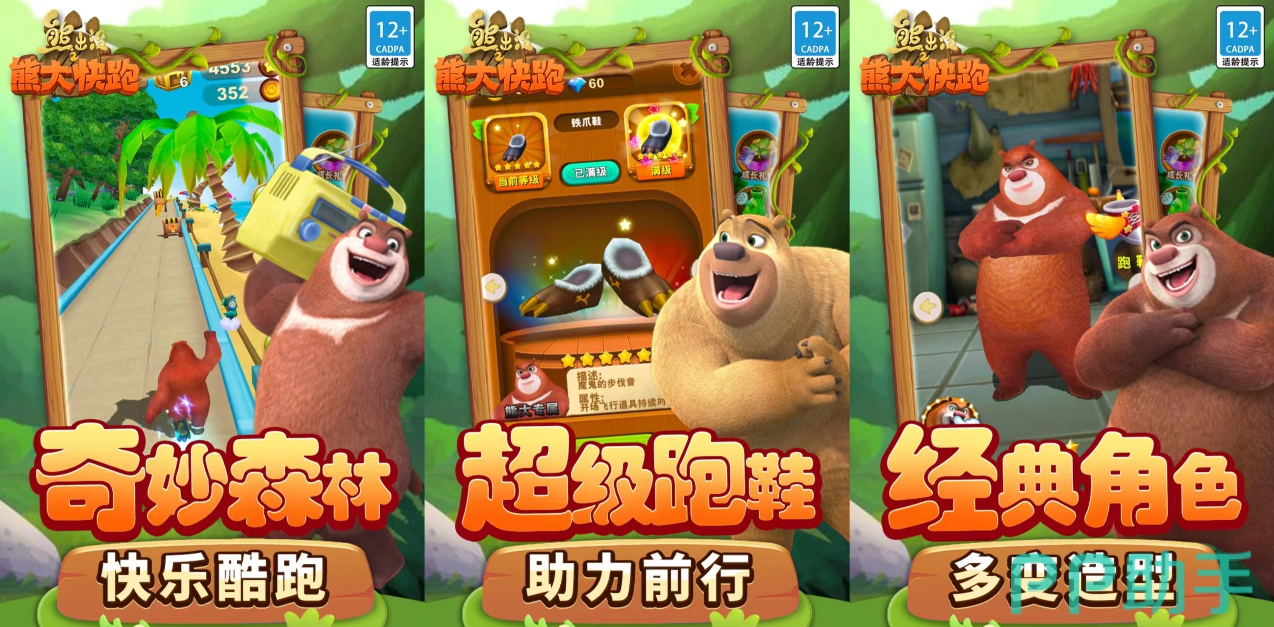 《熊出没之熊大快跑》在玩游戏的过程中也可以看到一些熊出没的剧情,玩家可以通过屏幕来操控角色进行移动,不过在跑步的过程中会随机出现障碍,需要更加快速的使用手指来避免这些障碍。在玩家的后面会有光头强再进行抓捕,如果被光头强抓到游戏就会失败。玩家首先会获得熊大这个角色,通过完成游戏里面的解锁条件就会获得熊二,两个角色拥有的技能是完全相同的,还有其他的角色可以按照不同的条件来解锁。哎呀!