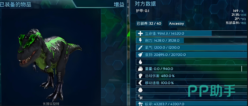 让大家细致了解一下霸王龙的基本特性,当霸王龙处于1级状态时,它的生命储备达到了1100点,体力维持在420点,氧气供应则有150点,食物储备相当充裕,拥有3000点。此外,它的负重能力为500点,近战时的攻击力能达到满额的100%,奔跑速度快捷,达到了515点,而在水中的游动速度也有300点,对于麻醉的抵抗力也相当高,达到了1550点。霸王龙不仅是力量惊人的恐龙种类,更是仅次于蓝巨的顶级肉食狩猎者。