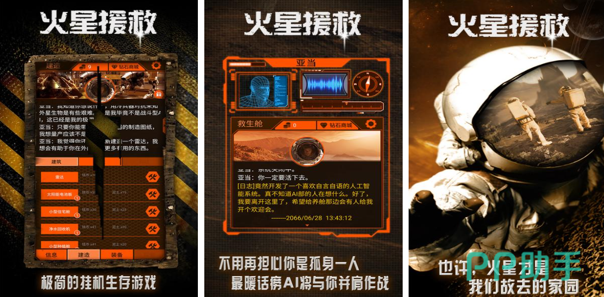 火星援救这款文字挂机生存类游戏继承了同名电影的内容设定,游戏主角由于意外事故被滞留在巨大的火星上,你要利用挂机生存的方式尝试在火星之上生存下去,极简的美术表现以及丰富的剧情演绎让这款佳作更具魅力,太空人的角色形象与火星救援的主题也是相辅相成,你不用担心自己太过孤独因为有着AI人机会陪你一起生存,快快进入神秘的火星地图上挣扎求生吧。