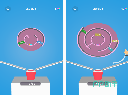 它是利用球球来闯迷宫的,也是儿童在生活中比较常见的玩法,也有类似的玩具,通过用手指控制球球移动的方式让骑士里的到达桶内,你就能取得胜利。由于小球的性质一直会蹦蹦跳跳,所以想要让其顺利的进入桶内并不是一件容易的事情,可通过旋转轮子迷宫的方式做到。如果自己收集了很多小球将桶填满的情况下说明你的成绩是非常好的,玩的过程中特别解压。