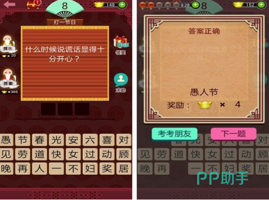 古代猜灯谜是传统节日当中必备的娱乐项目,如果你也很喜欢这种答题类型的话,可下载以灯谜为主的。既能展现一下自己的智商,进行智力方面的挑战。也是寓教于乐的,在玩的时候通过分享给好朋友的方式共同享受欢乐,展开智力的比拼,看看谁闯过的关卡越多。相对于线下玩的灯谜游戏,这款在线上玩的内容更丰富。