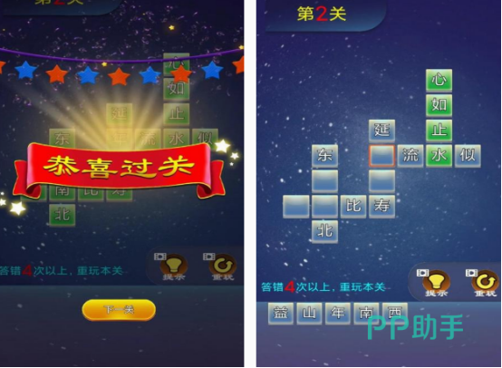 这款解字谜的,考验玩家在成语这方面的水平,在各种组合的关卡中你需要在提示的文字当中,正确的填入方格内,保证横竖数列的成语是成立的,这样就能通关。但如果你在玩的时候答错4次以上的情况下就没有办法通过,需要重新开启游戏。所以为了更好的让自己顺利通关,需要把握每次机会,也支持提示功能,仔细观察成语的含义,避免填错的情况发生。