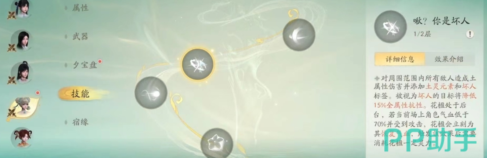 除了进场技能,花楹还有两主动技能,分别是攻击技能和治疗技能,一技能是一个上场有着不俗的攻击,下场还可以给队友提供治疗的技能,在场上时,花楹会移动对敌人进行标注,只要被标注上的敌人,敌人自身的抗性就会直降15%,还会迎来花楹土属性的狂轰滥炸,在后台的时候,花楹也不休息,她就会给队友提供治疗,若是队友的血量已经不足70%时,花楹就会紧急给队友恢复气血。