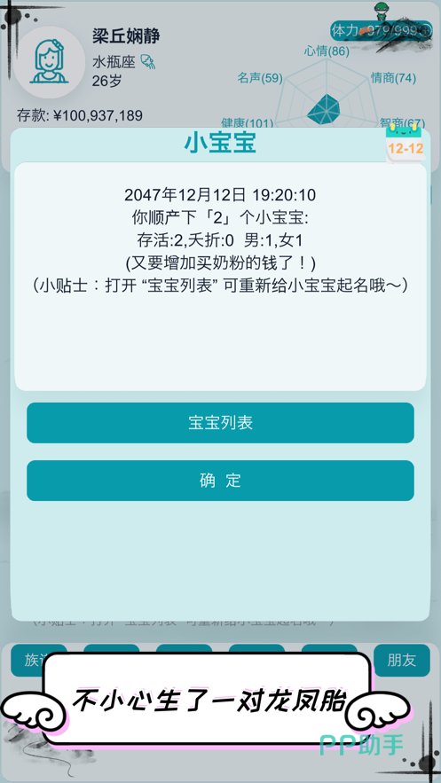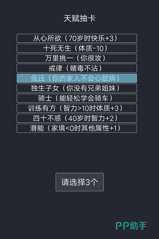 这是一个文字冒险类的模拟人生小游戏,大家的每个决定都是会出现不同命运的分岔口。初始属性如同命运的种子,影响着未来走向。游戏界面简洁直观,玩家可轻松选择不同人生路线,还能按照需要重启多次。丰富的剧情和多样的人生路径,从普通到辉煌又或者遗憾早逝,皆在一念之间。让我们在虚拟世界中重新思考自己的人生选择。