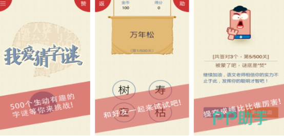 有着古风韵味,不仅能完成单人挑战,提供丰富的社交互动,可邀请好友共同参与,涵盖大量谜题库,比如动物地理等多种不同的类型。除了有猜字谜之外,还有其他分数玩法,比如人们喜欢的成语接龙,又或者是字谜填空,采用寓教于乐的方式,在充满欢乐氛围环境下完成字谜挑战,学习更多词汇,感受文化内涵。